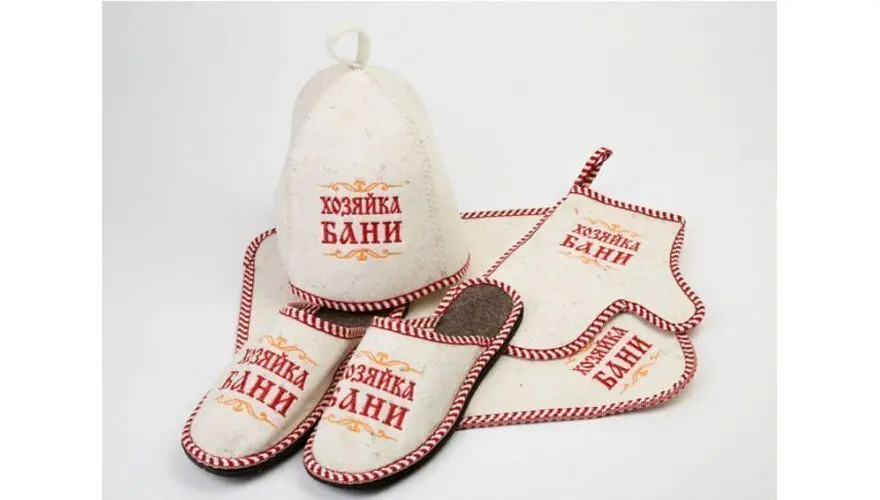 Набор выполнен из серого войлока 80% шерсти и 20% уплотнительного волокна плотностью 425гр на м2. Окантовка из 100% хлопка по периметру изделий держит их форму на долгий период эксплуатации. Тапки с антискользящей подошвой имеют универсальный размер от 40 до 43.