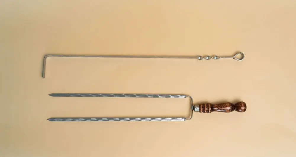 Набор для шампуров и принадлежностей. Закрывается клапаном на липе. - Длина чехла в закрытом состоянии 82см. - 1шт. Чехол с ручкой и может вмещать в себя шампура с рабочей длиной до 50см Цвет чехла коричневый. Вид чехла рептилия.- Шампур из пищевой нержавеющий стали толщиной 3мм, шириной 12мм, длиной рабочей части 50см, завитки для удержания поворота шампура 7см, деревянная ручка 15см защищена нержавеющим колпачком. Общая длина шампура 72см. Подойдут для мангала с шириной жаровни до 50см.- Нож-вилка. из нержавеющей стали, с деревянной ручкой, защищенной нержавеющим колпачком. Удобный для снятия мяса, надреза для проверки готовности, чистки шампура, Открыть пробку на бутылке и наколоть мяса для пробы.