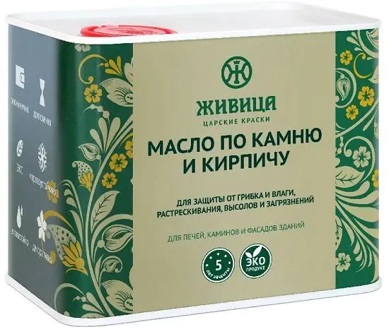 Масло для кирпичаикамня является водоотталкивающей пропиткой для каменных фасадов зданий, заборов, фундаментов и т.д. Придает кирпичной и каменной кладке изнутри и придавая обрабатываемой поверхности свойство водоотталкивания. Царские краски Живица представляют специально разработанное «Масло по камню и кирпичу». Масло создает защитную эластичную пленку, устойчивую к воздействиям воды, предотвращая появление высолов на поверхности.