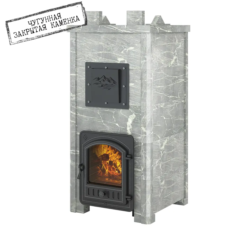 Печь состоит из двух модулей: топочной камеры и закрытой каменки из чугуна. Наиболее термонагруженные участки печи сделаны из жаропрочного чугуна толщиной 20 миллиметров.