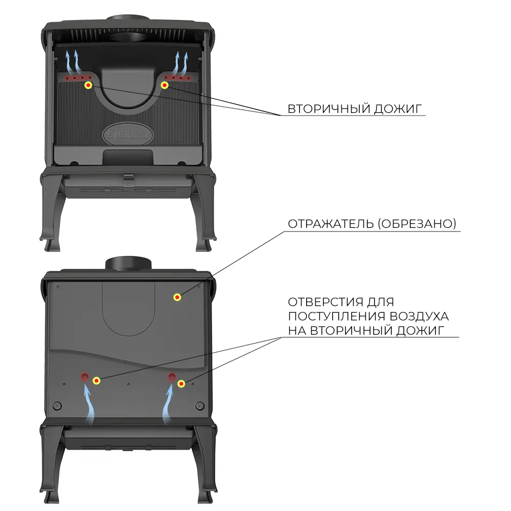Печь-камин EVEREST F11 изготовлена из качественного жаростойкого чугуна (ГОСТ 1412-85)  с толщиной стенок 6-14 мм. Вес печи составляет 130 кг. Модель рассчитана на обогрев помещений объёмом до 220 м³. Топка Печи камина усилена чугунными вставками с системой вторичного дожига. С помощью этой функции по каналам подачи вторичного воздуха поступает воздух, который нагревается при прохождении между топочной камерой и стенками корпуса. Далее нагретый воздух через дефлектор поступает в топку, перемешивается с газами - продуктами горения, чем вызывает повторное возгорание. Над дверцей печи-камина расположена система чистое стекло, которая помогает оставаться стеклу чистым. В нижней части дверцы расположена ручка для регулировки подачи воздуха в колосниковую зону. Патрубок дымохода Ø 150мм – универсальный, со сменным положением. Он может быть установлен сверху или сзади в зависимости от размещения печи в помещении.